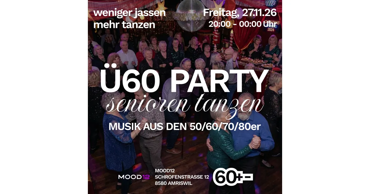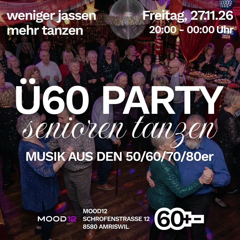 Ab sofort heisst es einmal im Monat am Freitag: Musik aufdrehen, gute Laune mitbringen und gemeinsam den Dancefloor geniessen. Mit DJ, Bar, funkelnder Disco-Kugel und jeder Menge Lebensfreude wird das MOOD12 zur neuen Anlaufstelle für alle tanzfreudigen Ü60-Gäste.